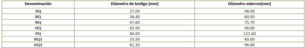 El primer punto a resolver es el diámetro con el que se quiere perforar; los diámetros estándar en minería se muestran en la tabla inferior. Los más utilizados actualmente corresponden a la denominación NQ y HQ. El agregado del número 3 a la denominación, indica que lleva un tubo interior (un tercer tubo) por lo que el diámetro del testigo será algo menor que el correspondiente al de doble tubo.