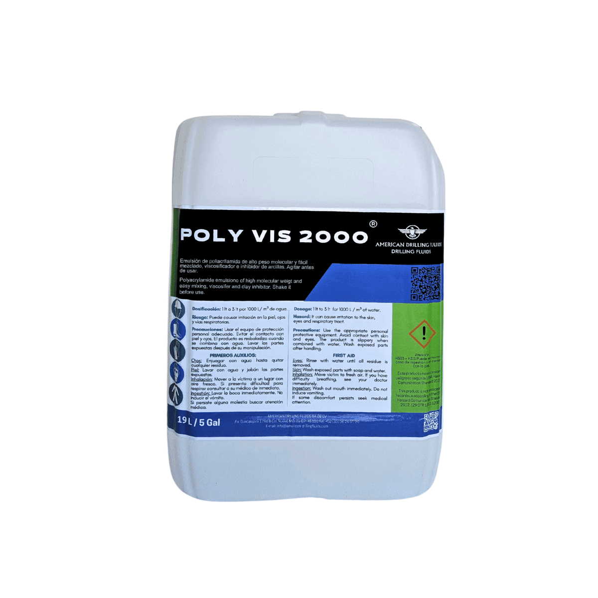 Se recomienda utilizar POLY VIS 2000 de 1 a 1.5 litros por cada 1000 lt de agua y está especialmente diseñado para viscosificar, estabilizar lutitas e inhibir arcillas. Encapsula los detritus sacándolos a la superficie, mantiene el barreno limpio e impide el hinchamiento de arcillas en un 80 a 90 %.